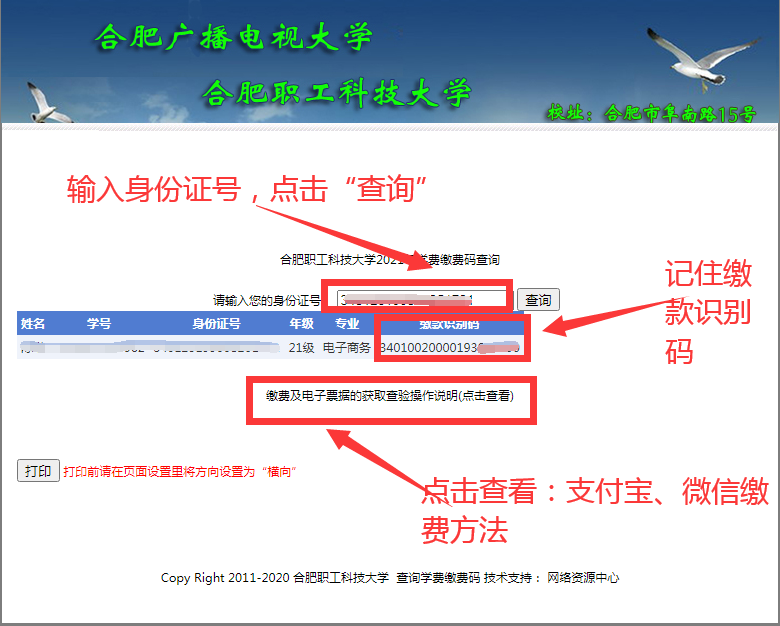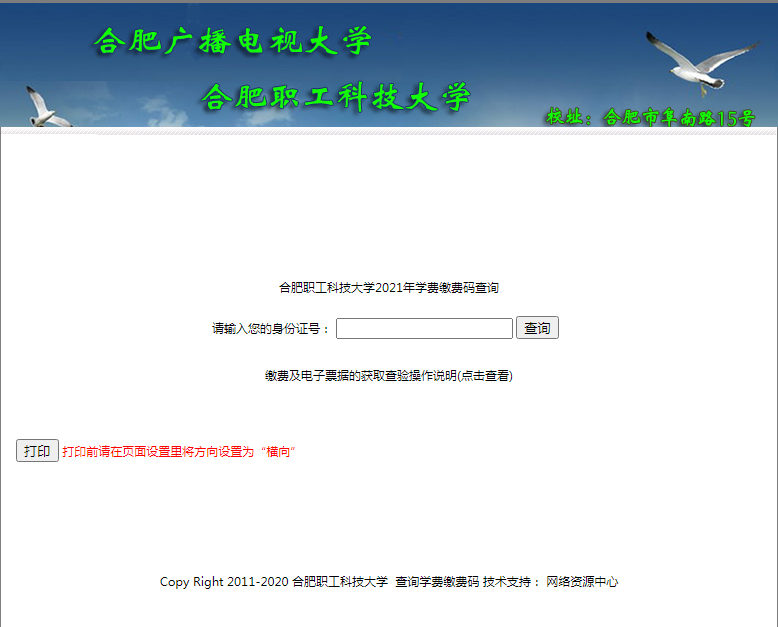 查询方式一:登陆合肥职工科技大学缴款码查询网页hftvu.net.cn:8080/hfzkdjfm,输入身份证号码查询;