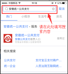 1、打开支付宝首页,在搜索栏输入“安徽统一公共支付”,如图: