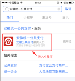 2、点击小程序“安徽统一公共支付”(圈内所示)进入;