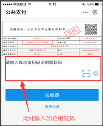3、在相应位置输入缴款码,按照提示,完成缴费。如图所示: