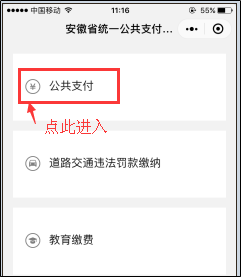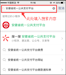 1、打开微信首页,在搜索栏内输入“安徽省统一公共支付平台,出现下图,请选择所标注的小程序进入。