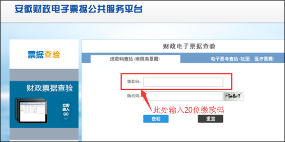 4、缴款人缴款成功大约5分钟后,登陆到“安徽省财政电子票据公共服务平台”凭缴款码即可查验下载电子票据。