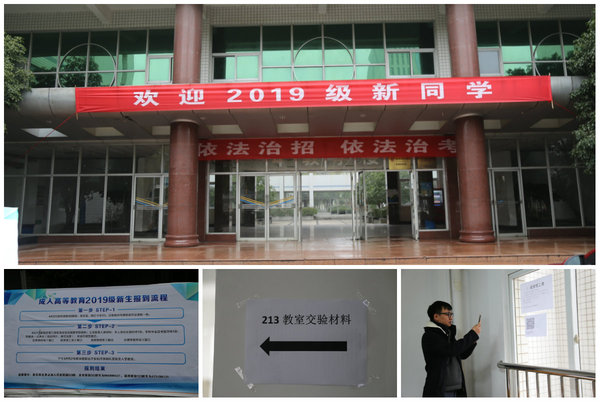 2月23日,新生报到工作在四号教学楼213教室进行,为方便同学报到,学院在教学楼前悬挂迎新条幅,张贴报到流程图。