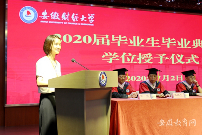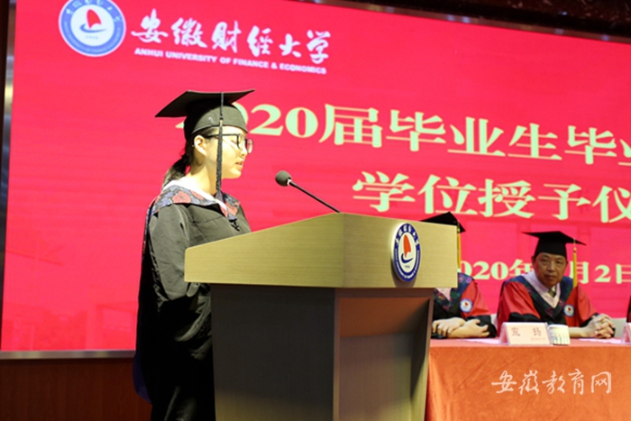 本科毕业生代表、会计学院胡玲玲在发言中分享了自己大学四年的求学历程,表达了对母校的感激之情。研究生毕业生代表、金融学院唐景宜表达了感恩母校和难忘母校的情怀,并分享了自己研究生生涯追梦和筑梦的感受。教师代表、工商管理学院教师杜晶晶在发言中希望所有毕业生牢记校训,践行社会主义核心价值观,脚踏实地迈向社会、走向成功、描绘出绚烂多彩的人生。