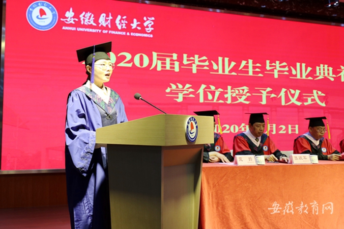下午三时,在雄壮的国歌声中,2020届毕业典礼正式开始。杨烨主持毕业典礼。丁忠明代表学校全体师生深情寄语“最特别的”2020届毕业生,向共克时艰、顺利毕业的5935名同学表示最热烈的祝贺和最美好的祝福!丁忠明简要介绍了2020届毕业生在各方面取得的优异成绩,为他们用实际行动践行安徽财经大学“诚信博学、知行统一”的校训精神,充分展现了安财学子追求卓越、全面发展的良好精神风貌感到由衷的骄傲和自豪。丁忠明表示,突如其来的新冠肺炎疫情打乱了大家的学习、工作和生活节奏,也正在深刻地影响和改变着世界格局。疫情也促使大家更深入地思考,作为一名安财人、一名财经人,我们应该如何肩负起自己的使命和担当。丁忠明希望同学们要以人为本,以博大的胸怀拥抱世界;要弘扬爱国精神,以炽热的情怀报效国家;要夯实专业能力,以高强的本领奉献社会;要锤炼高尚品格,以利他的思维服务人民。