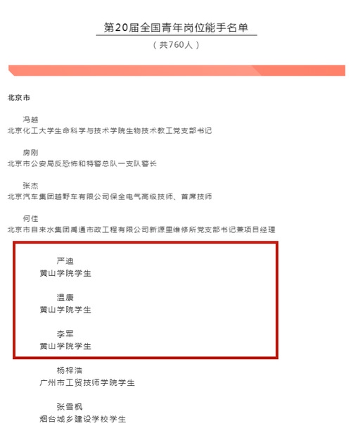 近日,共青团中央、人力资源社会保障部联合开展第20届全国青年岗位能手评选活动,黄山学院学生严迪、温康、李军三位同学荣获“全国青年岗位能手”称号。