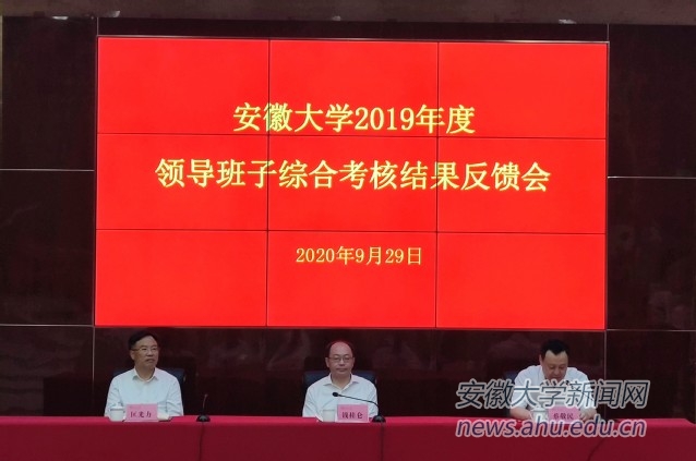 9月29日上午,学校在文典阁报告厅召开2019年度领导班子综合考核结果反馈会。省委教育工委书记钱桂仑代表省委反馈我校领导班子综合考核结果:安徽大学领导班子2019年度综合考核得分为98.42分,被评定为“优秀”等次。全体校领导参加会议,会议由校党委书记蔡敬民主持。