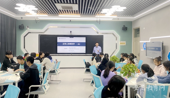 10月26日,是安徽中医药大学2020级新生开课第一天。在智慧教室里,学校2020级中西医临床专业7班的新生正在听取中西医结合学院教授申国明老师讲授的正常人体解剖学课程。2020级中西医临床专业其他6个班400位同学通过线上与线下相结合的形式聆听了这堂课,这堂“开学第一课”同时有全国5.41万人同步在线同屏学习。