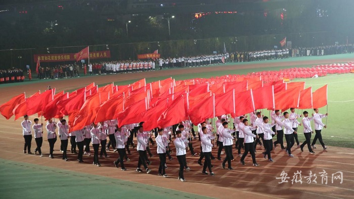 今年,安徽师范大学特地将运动会开幕式放在灯光璀璨、激情飞扬的夜晚举办。晚上7时,伴随着激情昂扬的乐声,国旗、校旗、各色彩旗迎风飘扬,北体育场内各方阵队整装待发,安徽师范大学19个学院按既定顺序有序入场。国旗、校旗、会徽和校训方队,首先拉开了安徽师范大学各学院方阵入场的序幕。安徽师范大学体育学院组成的红旗方阵和裁判员方阵紧随入场。安徽师范大学地理与旅游学院的学生身着各具特色的职业装以及少数民族服饰,他们穿着不同的服饰,跳着欢快的舞步,彰显着地理与旅游学院专业化、多元化办学特色和团结向上的青春气息。安徽师范大学法学院高举着《中华人民共和国民法典》的鲜红封面阔步而来,彰显着法学生“崇尚法律、弘扬法治”的学子本色······安徽师范大学19个学院的方阵队各具专业特色,伴随着响亮的口号,他们以最饱满的精神、最自信的风采依次走过主席台,接受检阅。