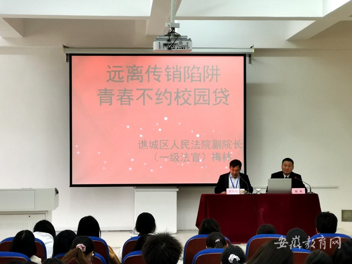 为进一步提高大学生的安全意识,引导大学生认清传销和校园贷等违法犯罪活动的本质和严重危害性,提高自我防护能力,维护校园安全稳定,亳州学院于11月4日下午在求是楼南第二报告厅举办“远离传销陷阱,青春不约校园贷”主题讲座。本次讲座由亳州市谯城区人民法院副院长(一级法官)梅林主讲,该院学工部部长谢英剑、学工部学生教育管理科工作人员及各院系学生代表一同聆听了讲座。