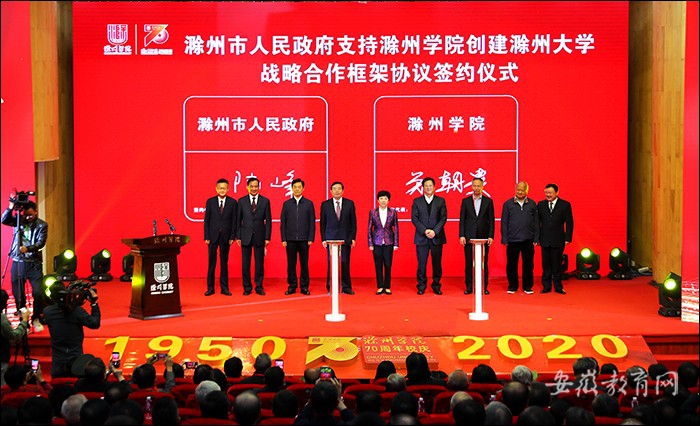 许继伟在会上作了讲话,对学校建校70年取得的重大发展成就表示祝贺。他说,学校继承优良育人传统,深入融入滁州高质量发展,大力开展产学研合作和科研成果转化,培育了一大批优秀的建设者和接班人,为滁州冲进全省第三提供了坚强的人才支撑。他指出,共建滁州大学战略合作框架协议的签订,标志着校地合作开启了新篇章、校地融合发展迈上了新台阶。希望滁州学院充分发挥人才智力、学术优势,以更大力度推进教育教学和科学研究,更高标准培养一流应用型人才,更高质量服务滁州经济社会发展。他表示,滁州市委、市政府将一如既往、全力以赴支持学院建设发展,为广大师生营造良好的工作学习生活环境,为学院早日建成国内知名、省内一流、特色鲜明的地方应用型高水平大学提供优良服务和有力保障。