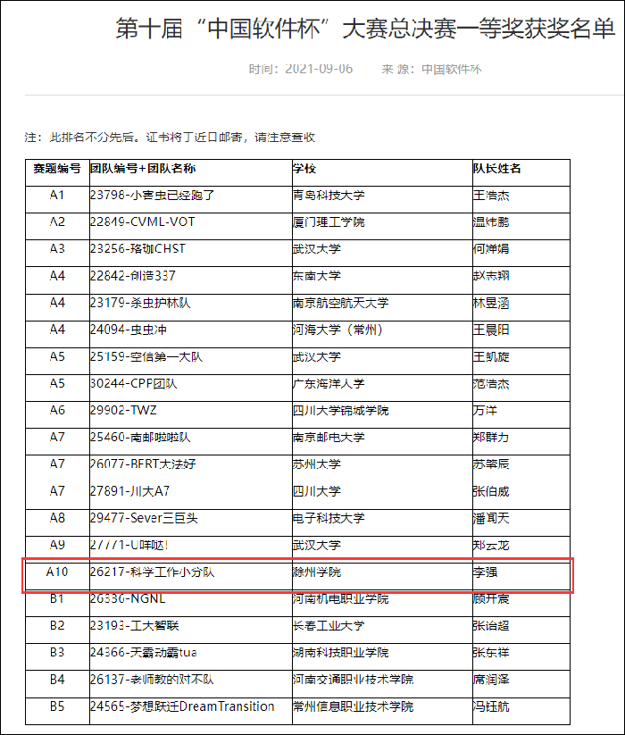 9月6日,滁州学院地理信息与旅游学院邓凯、杨灿灿老师指导的2018级地理信息科学专业学生团队,在第十届“中国软件杯”大学生软件设计大赛总决赛中获得国家级赛事一等奖。滁州学院也是本次赛事中唯一入选并获奖的安徽省高等本科院校。