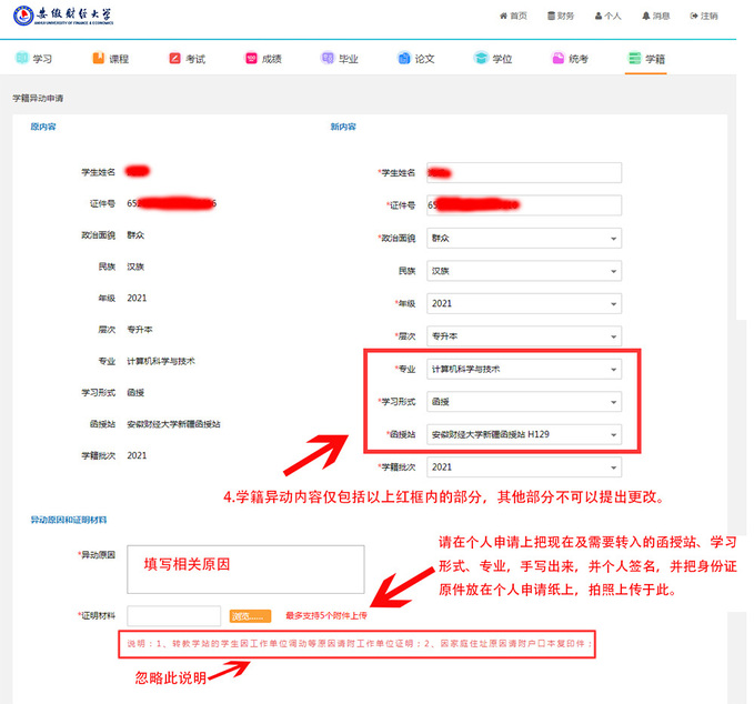 (4)学籍异动需要手写申请并附上身份证拍照,照片作为附件上传到系统。