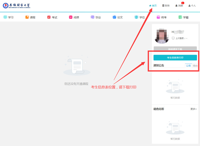 考生信息表打印办法:2022级新生先登录教务系统:acjjy.aufe.edu.cn/,登录用户名为个人学号,密码是身份证后六位。打印位置如图: